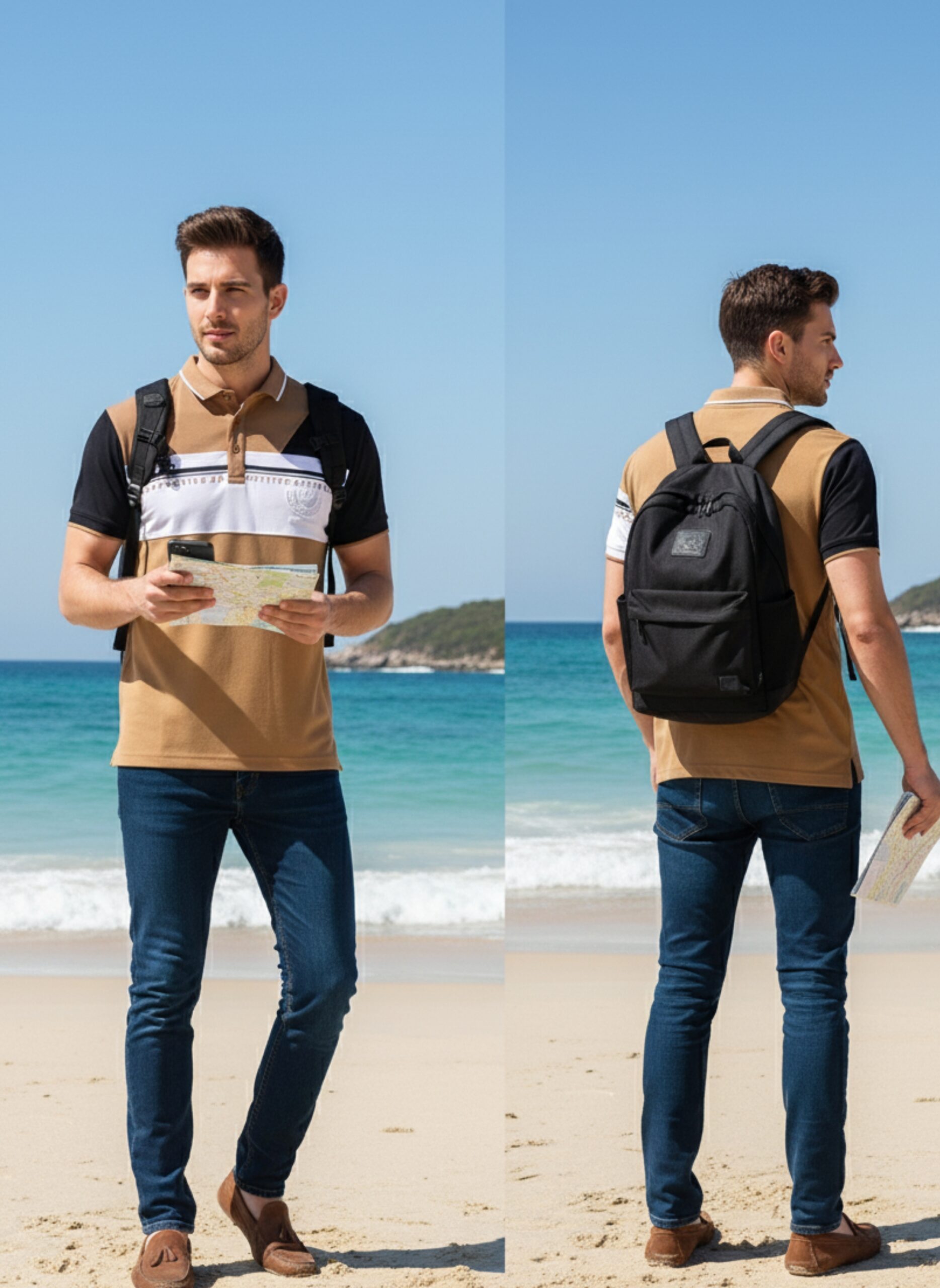 Step out in style with this modern colorblock polo T-shirt designed for comfort and a smart casual look. Featuring a tan base with contrasting black sleeves and a white chest panel, this T-shirt blends trendy design with everyday wearability. The collared neckline and short sleeves make it perfect for both casual outings and semi-formal occasions. Pair it with jeans or chinos for a versatile outfit.