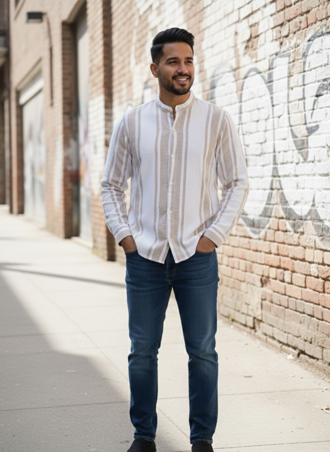 Why You’ll Love It: This band-collar striped shirt is your perfect companion for a relaxed yet stylish look. The unique textured stripes and comfortable fabric ensure you’ll feel great, while the modern collar adds a touch of understated elegance. It’s a versatile piece that easily transitions from day to evening.