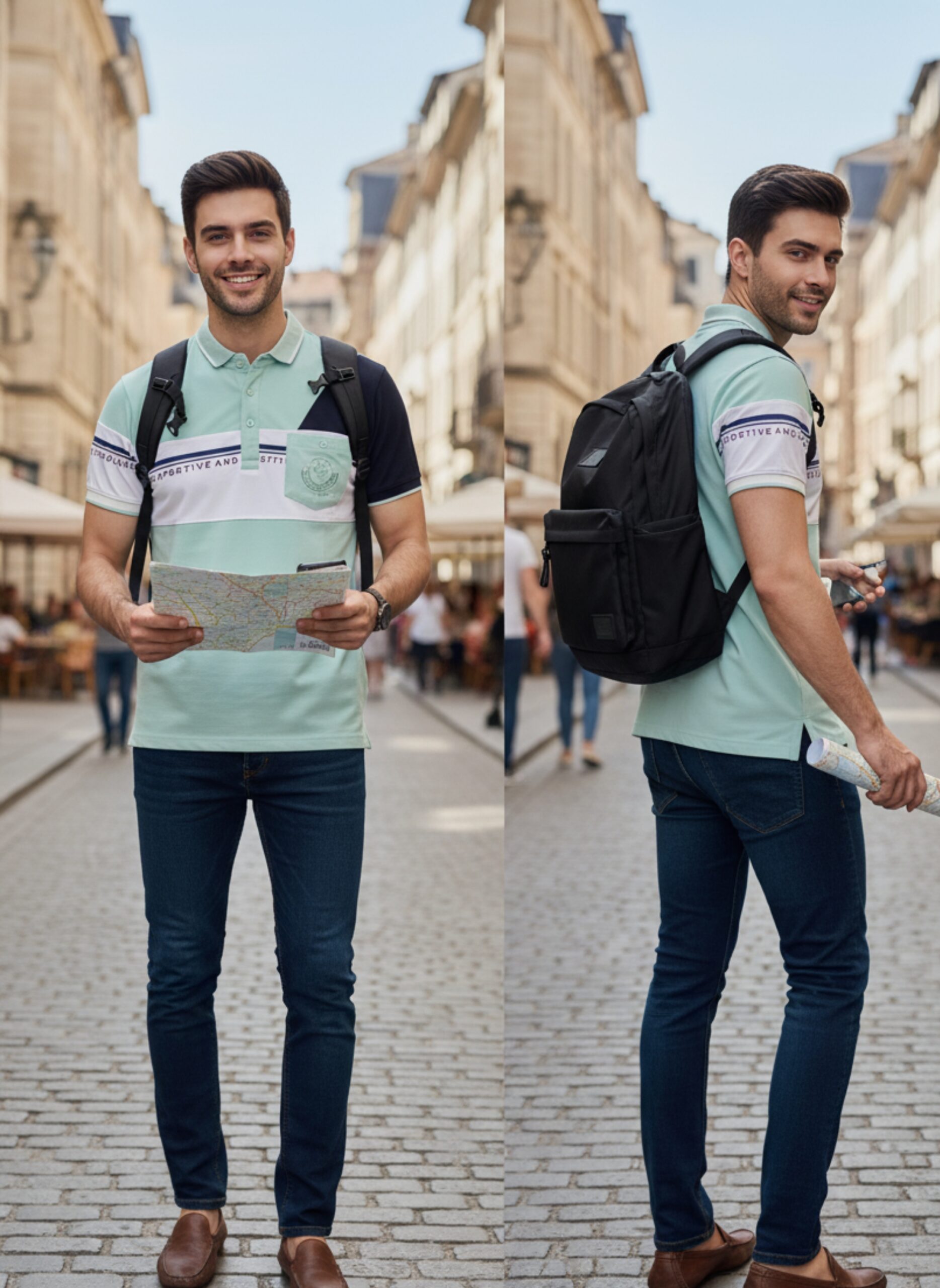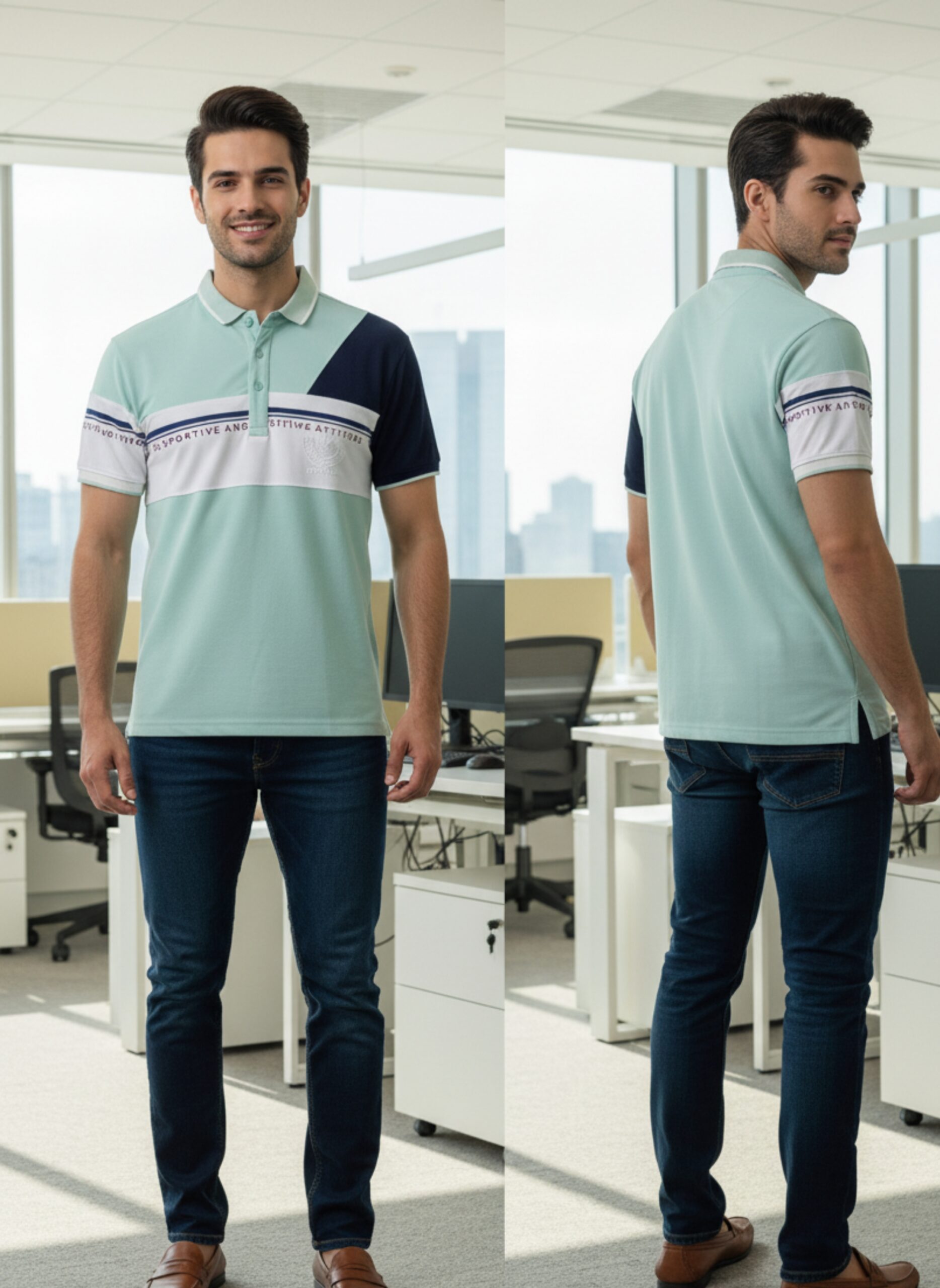 Add a touch of modern style to your wardrobe with this mint green polo T-shirt featuring navy blue and white colorblock detailing across the chest and sleeves. Designed with a classic polo collar and short sleeves, this T-shirt combines casual comfort with a smart look, making it perfect for both office casuals and weekend outings.
