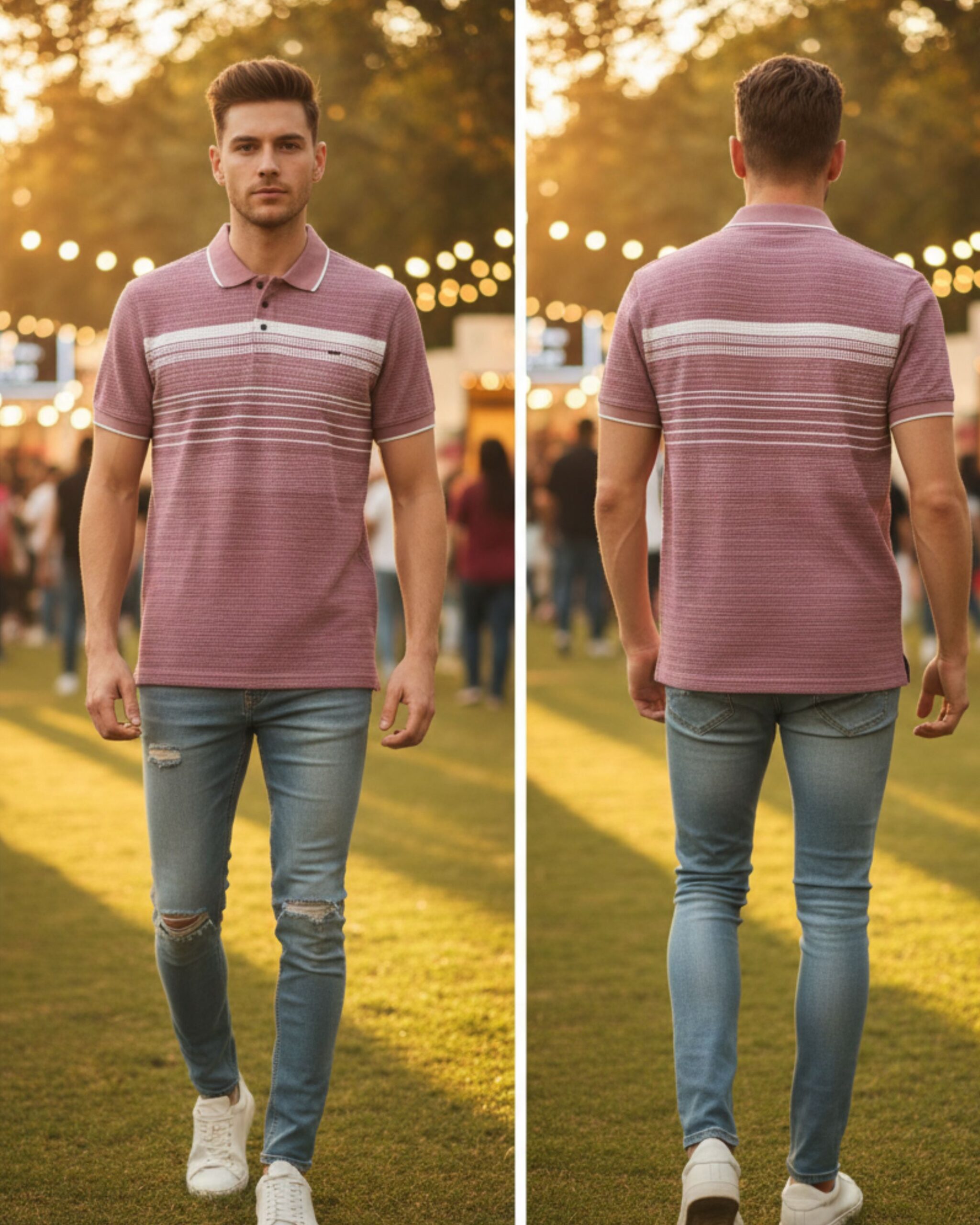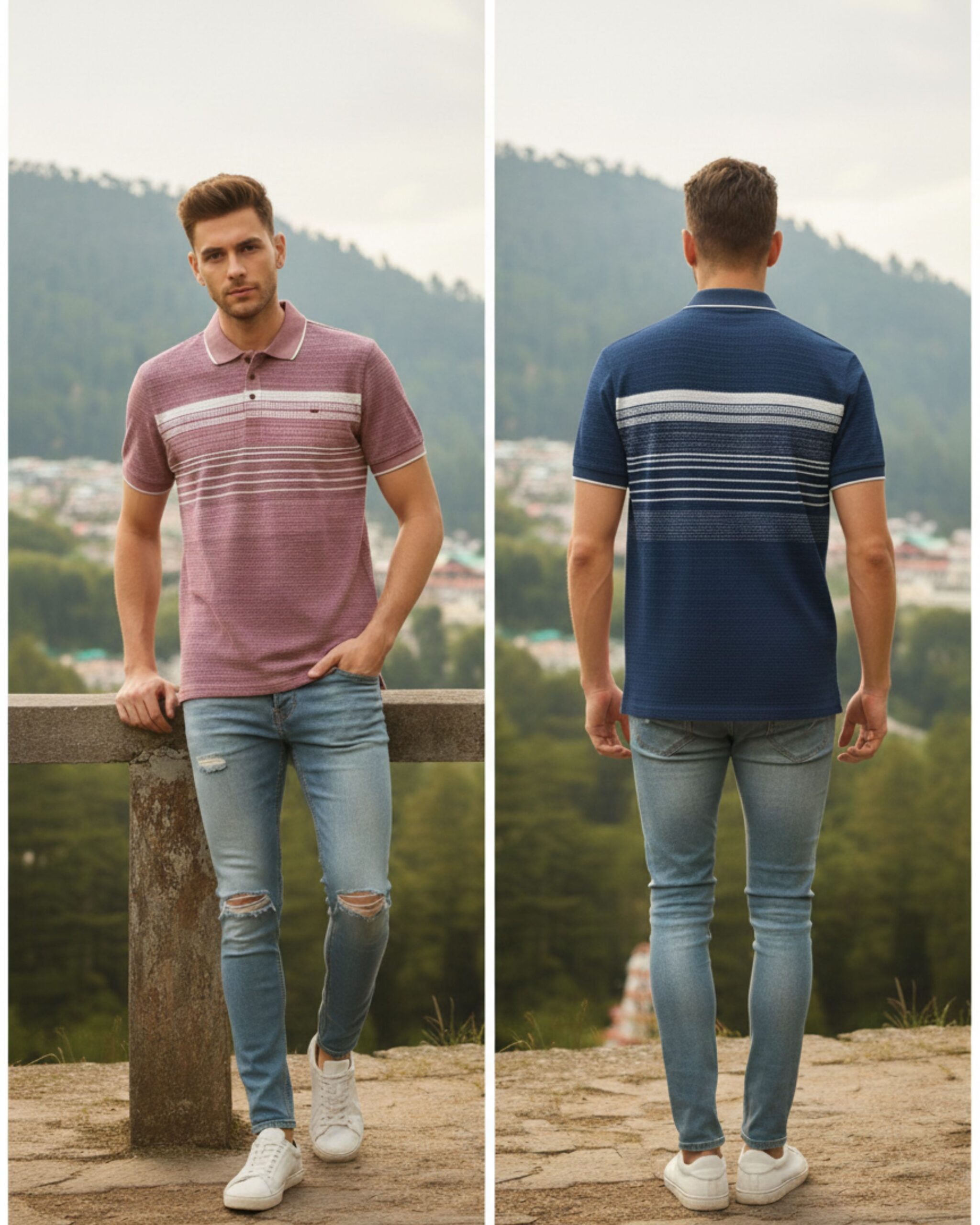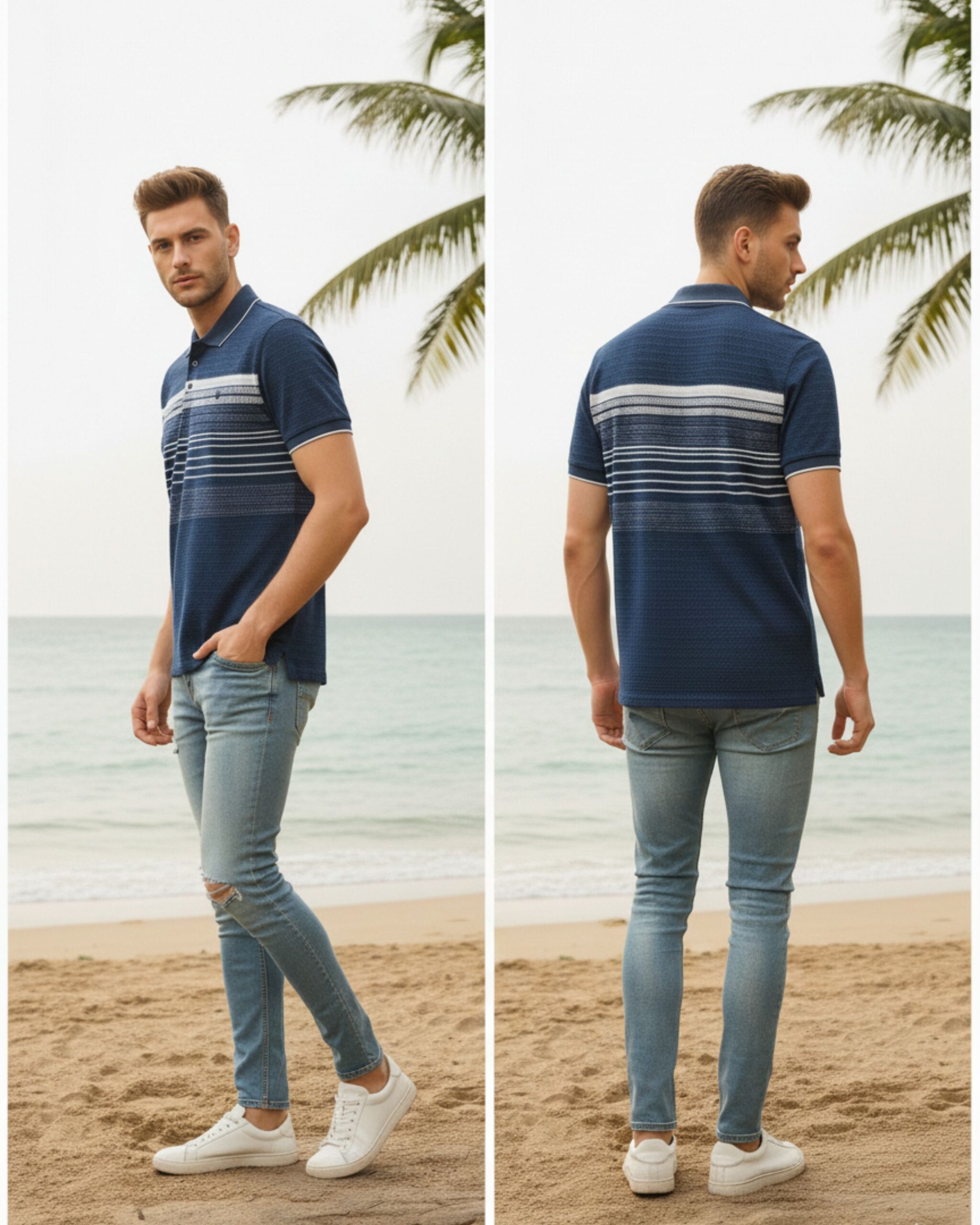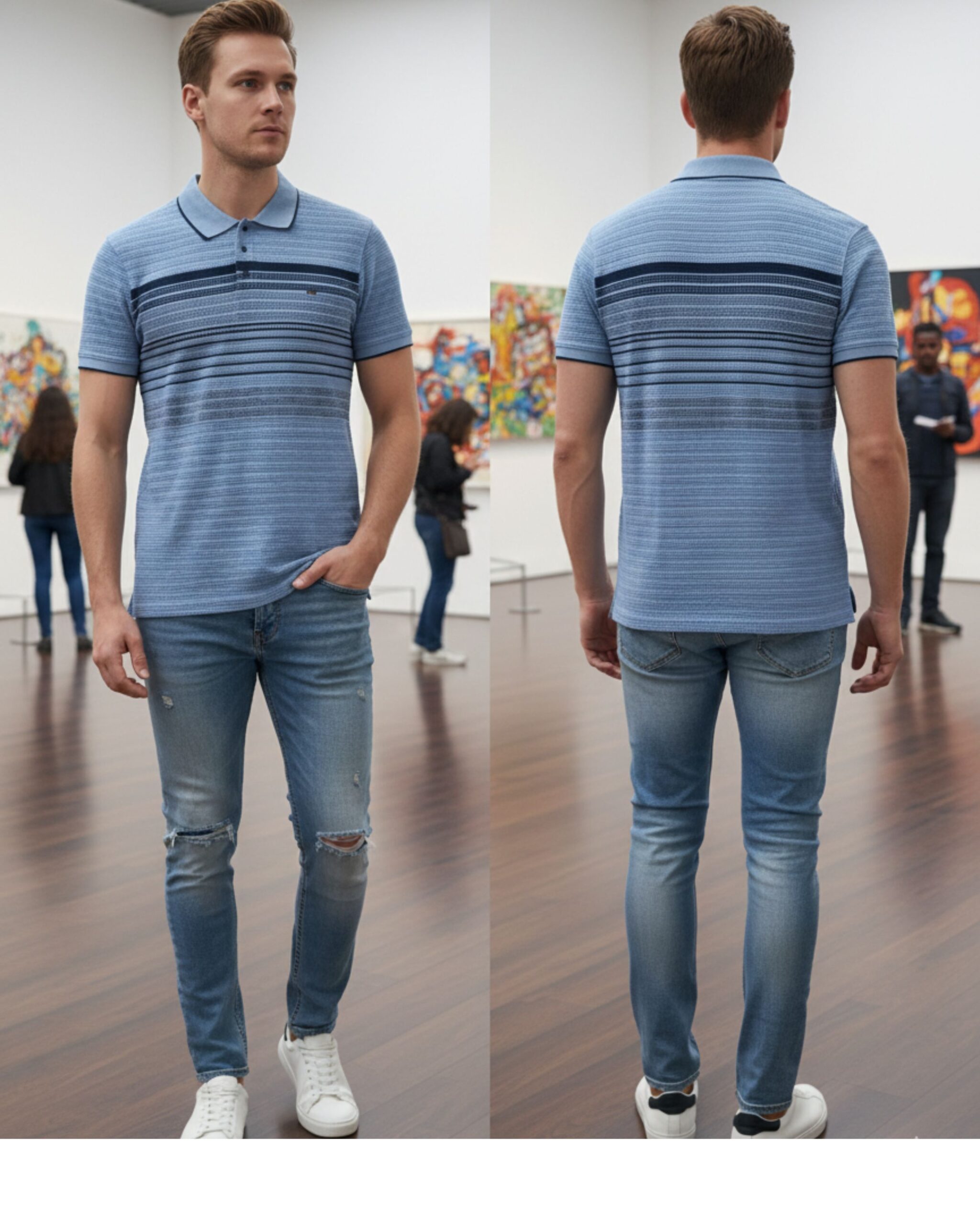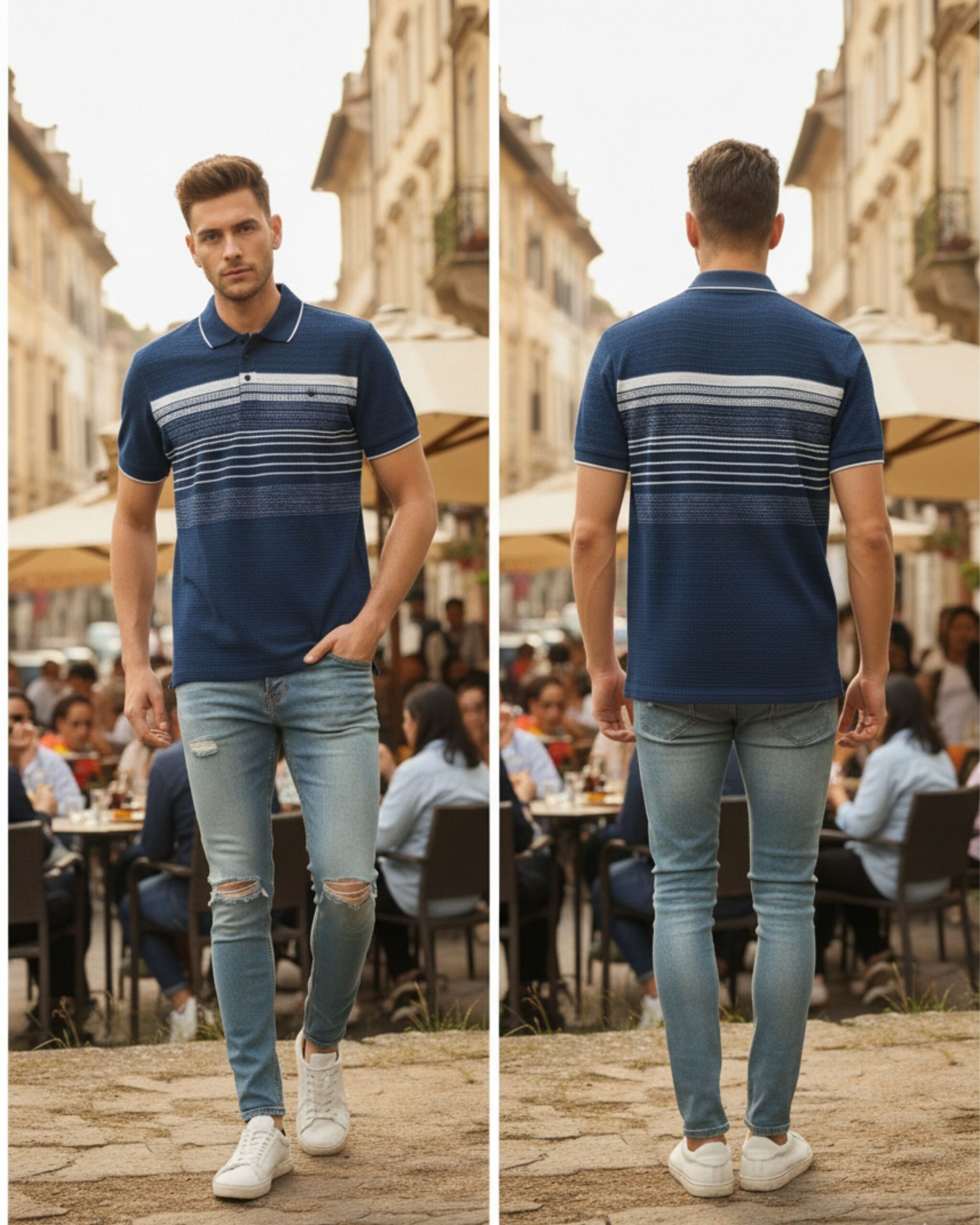 Upgrade your everyday style with this premium light blue polo t-shirt. Designed with finely detailed horizontal stripes and a neat button placket, it delivers a fresh, modern look that pairs effortlessly with jeans or chinos. The breathable cotton-blend fabric ensures all-day comfort, making it an ideal choice for outings, weekend wear, or casual office days.